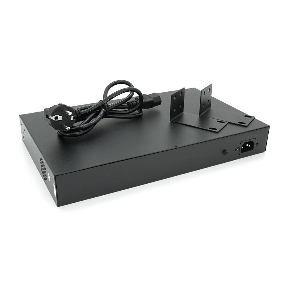Має 24 порти 100 М RJ45 і 2х Gigabit uplink порту. Порт 1-24 підтримує IEEE 802.3af/при потужності до 30 Вт. Загальна потужність PoE складає 250 Вт. Як пристрій живлення PoE він може автоматично виявляти та розпізнавати приймаючі PoE пристрої. Підходить для всього середнього та малого бізнесу!