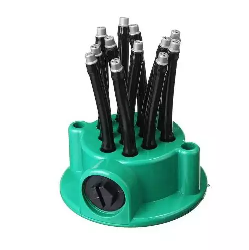 360-градусний автоматичний багатоголовний садовий спринклер – це пристрій для поливу саду, який розподіляє воду на 360 градусів навколо себе. Він зазвичай оснащений кількома головками чи форсунками, які розпорошують воду на всі боки, забезпечуючи рівномірний полив усієї площі. Цей тип спринклер часто використовується для автоматичного поливу газонів, квітників та інших ділянок землі в саду або на газоні.