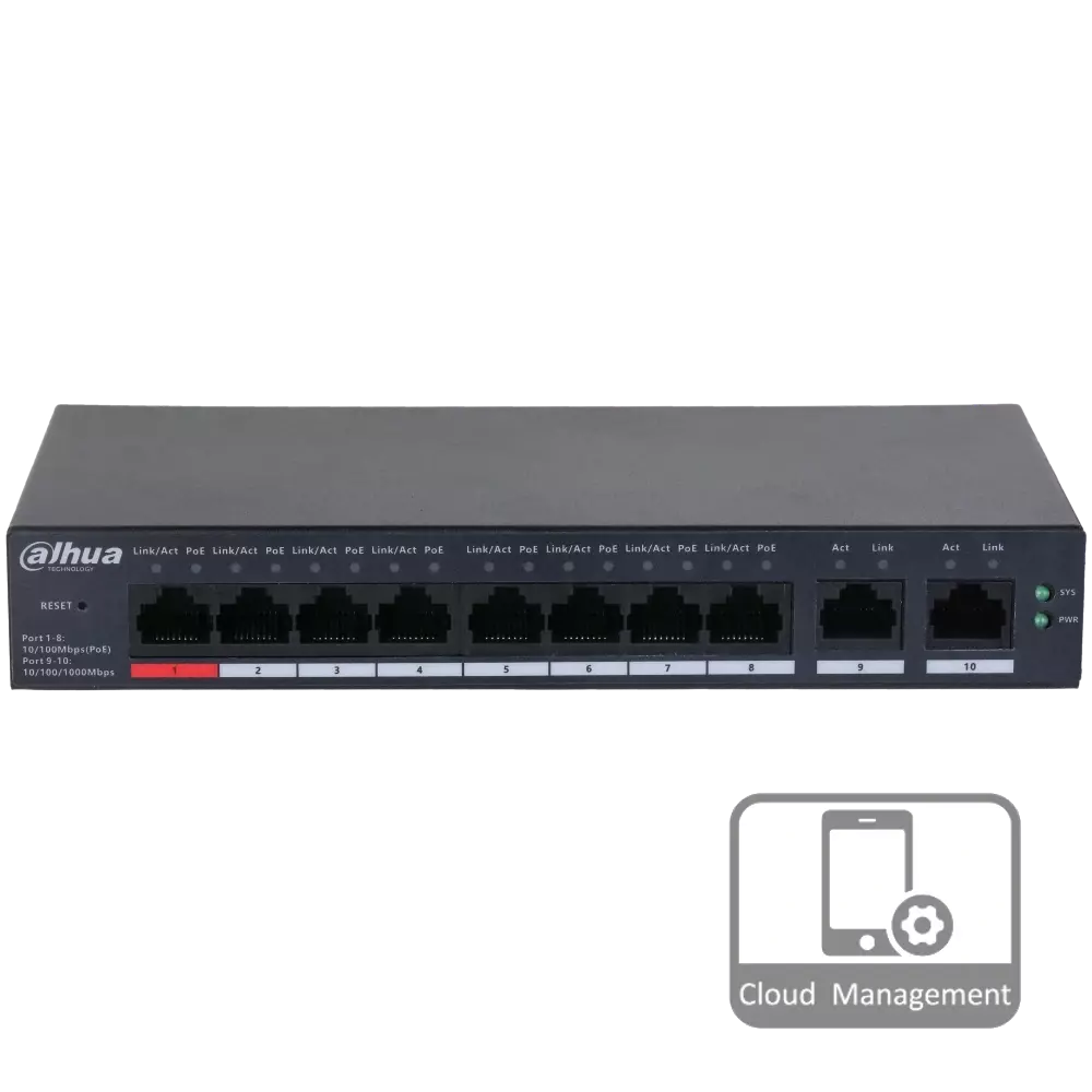 8-портовий керований PoE комутатор DH-CS4010-8ET-110 з 8 портами POE 100Мбіт + 2 порти UP-Link 1000Мбіт, 190x106x30 мм