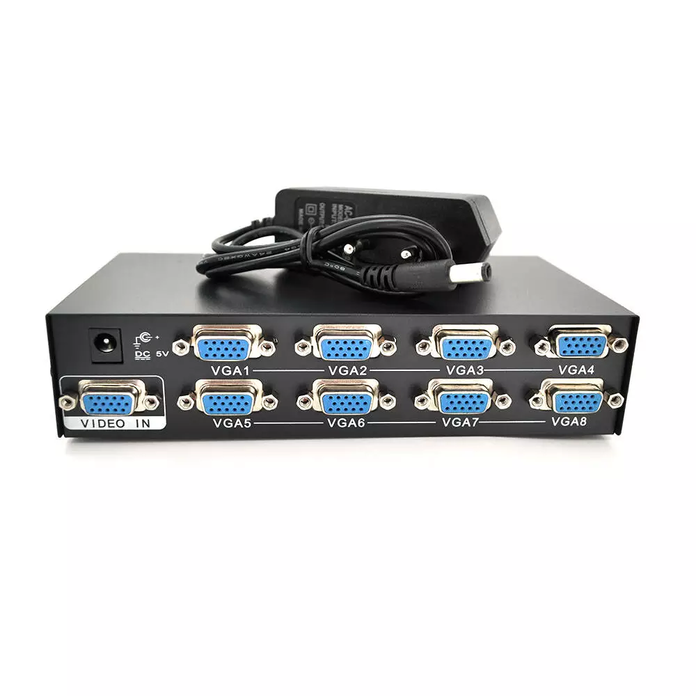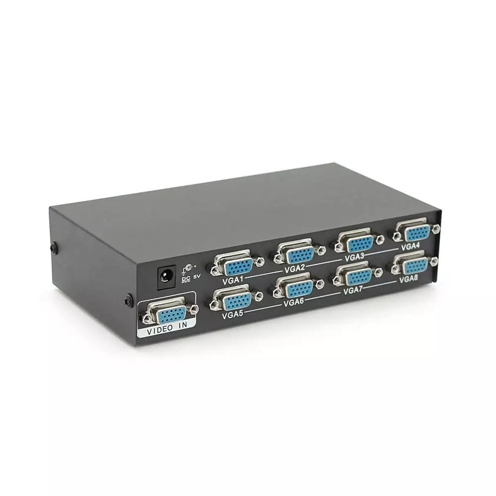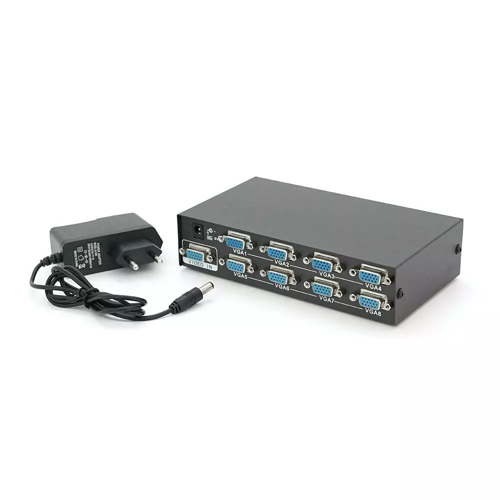 Активний спліттер сигналу VGA KV-FJ2508S призначений для розділення одного VGA сигналу на вісім портів з частотою до 150 МГц. Пристрій працює від джерела постійного струму з напругою 5 і струмом 2 А.