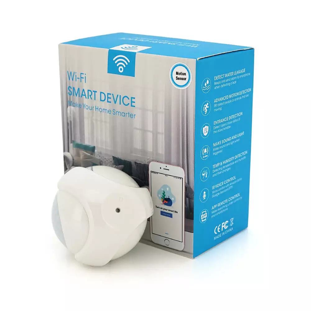 • Wifi датчик руху бездротової через невеликі розміри та відсутність будь-яких проводів швидко монтується на будь-який тип поверхонь. При установці необхідно переконатися, що в місці установки датчика є хороший сигнал Wifi від роутера.