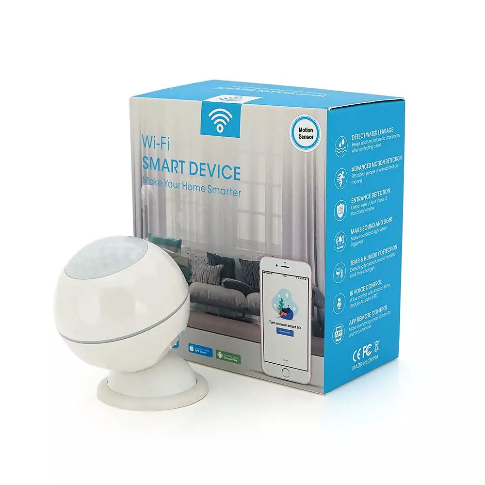 • Wifi датчик руху бездротової через невеликі розміри та відсутність будь-яких проводів швидко монтується на будь-який тип поверхонь. При установці необхідно переконатися, що в місці установки датчика є хороший сигнал Wifi від роутера.