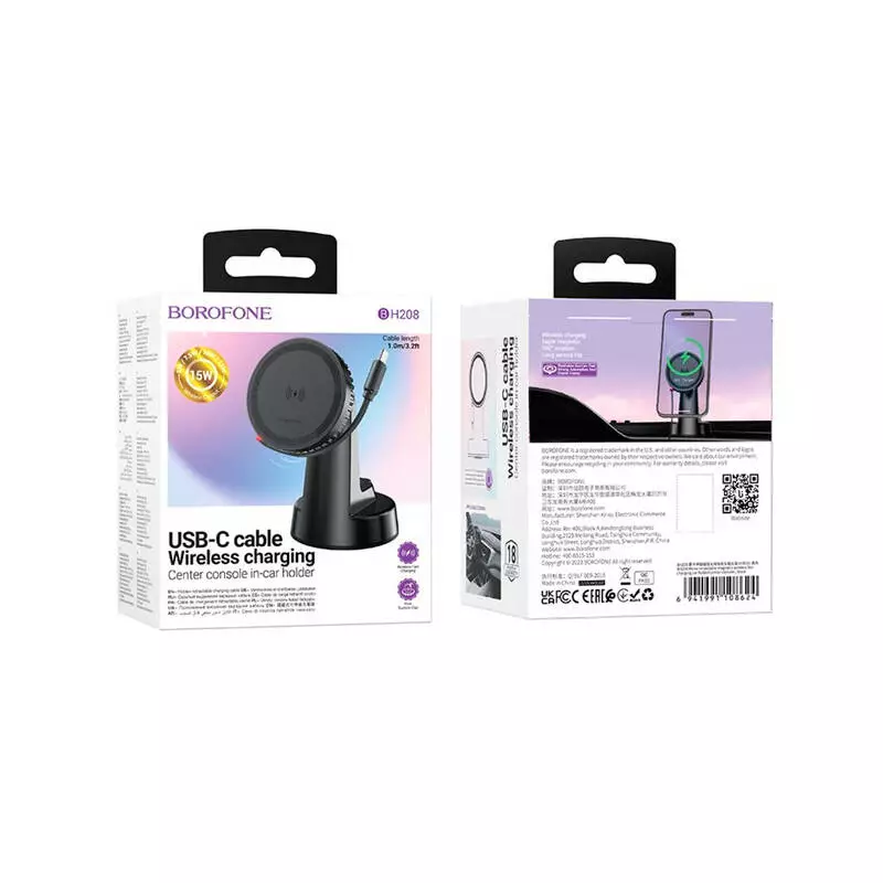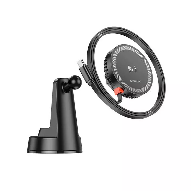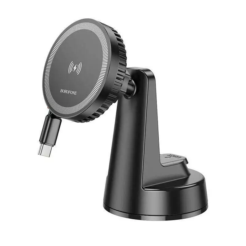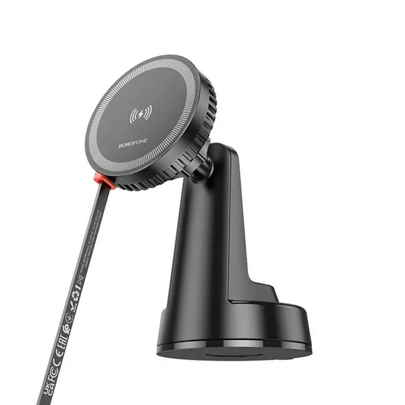 Автотримач BOROFONE BH208 + Wireless Charging 15W, кріплення на торпеду, клямка 50-90мм, Black, Box