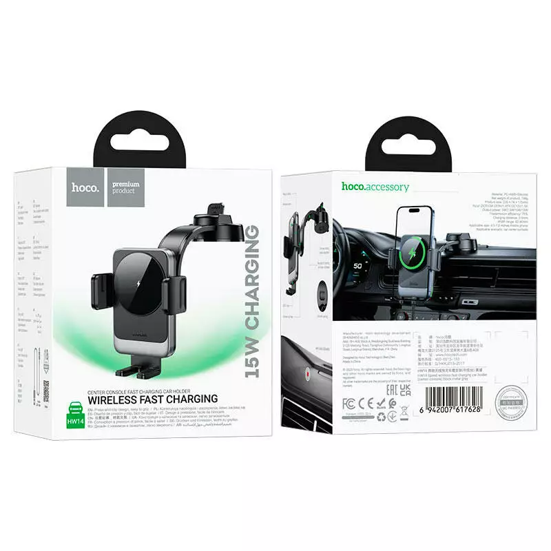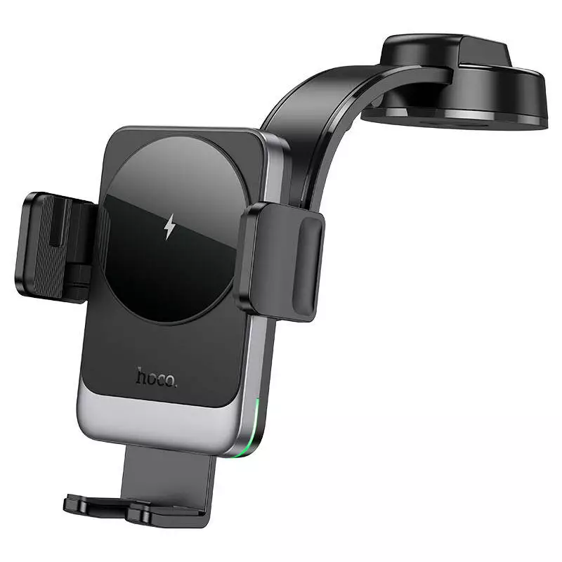 Автоутримувач HOCO HW14+ Wireless Charging 15W, кріплення на торпеду, затискач 55-90мм, Black, Box