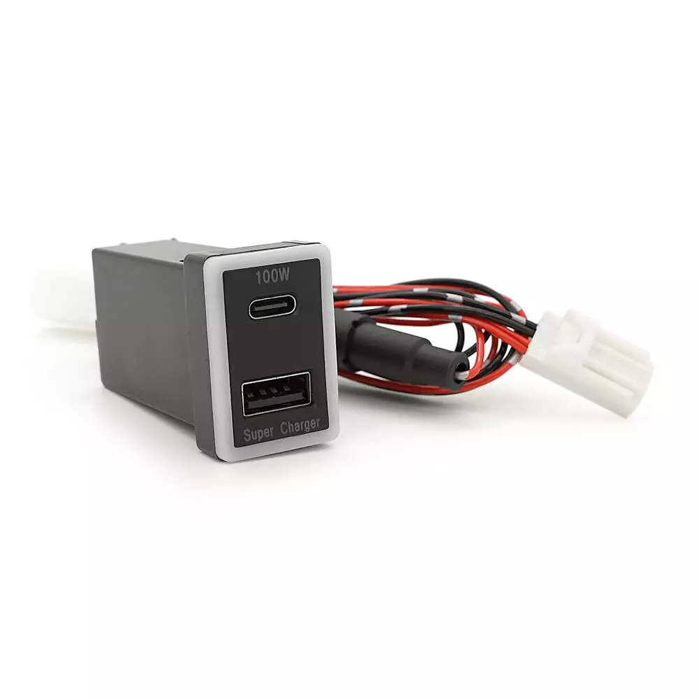 АЗУ врізне 130W-D01T03-С, PD+QC, Type-C: 100W, USB: 30W, LED підсвічування, комплект дротів з роз'ємами, 33x22х58mm, Black