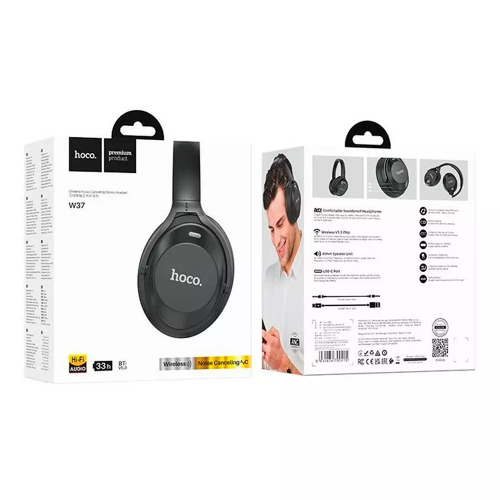 Бездротові навушники Bluetooth HOCO W37, виконані в чорному кольорі, упаковані в коробку.