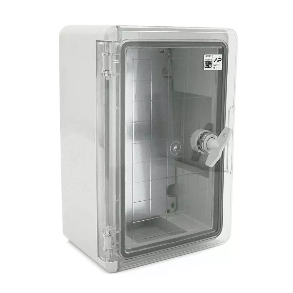 Бокс міцний з ABS пластику з монтажною панеллю 280х210х130, з прозорими дверцятами, IP65