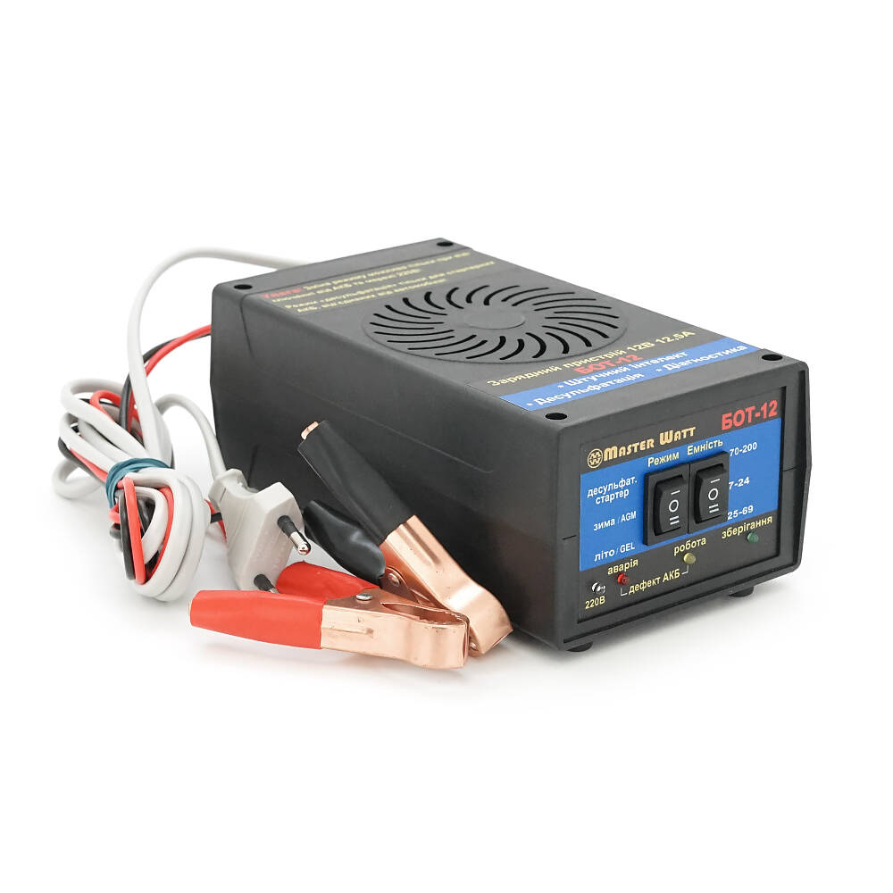 Зарядний пристрій "БОТ-12" призначений для заряду всіх типів 12-вольтових свинцево-кислотних акумуляторних батарей (АКБ),: