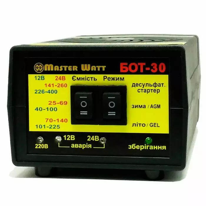 Зарядний пристрій "БОТ-30" призначений для заряду всіх типів 12-вольтових і 24-вольтових свинцево-кислотних акумуляторних батарей (АКБ),: