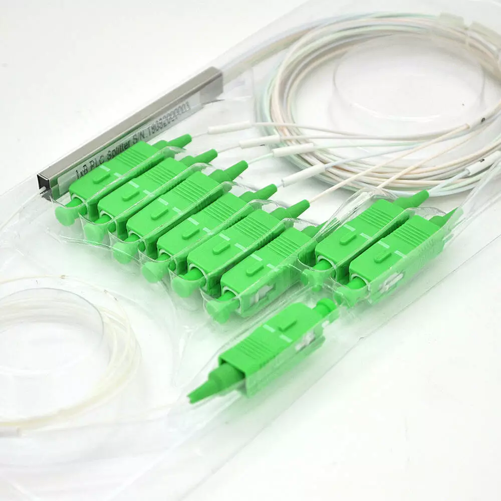 Дільник оптичний Coupler PLC оконцованнимі коннекторами SC / APC з кількістю висновків 8, від кількості висновків залежать розміри корпусу від 60 × 7х4 мм до 80 × 20 × 6 мм. Планарні оптичні сплітери є високопродуктивними, надійними і компактними пристроями для поділу потужності оптичного сигналу, які спеціально розроблені для застосування в мережах FTTH, PON і CATV. Засновані на унікальній хвильової технології іонного обміну в скловолокна. Ці сплітери / розгалужувачі мають дуже низькі вносяться втрати і PDL (поляризационно залежні втрати), відмінну рівномірність каналів і широкий робочий діапазон довжин хвиль.