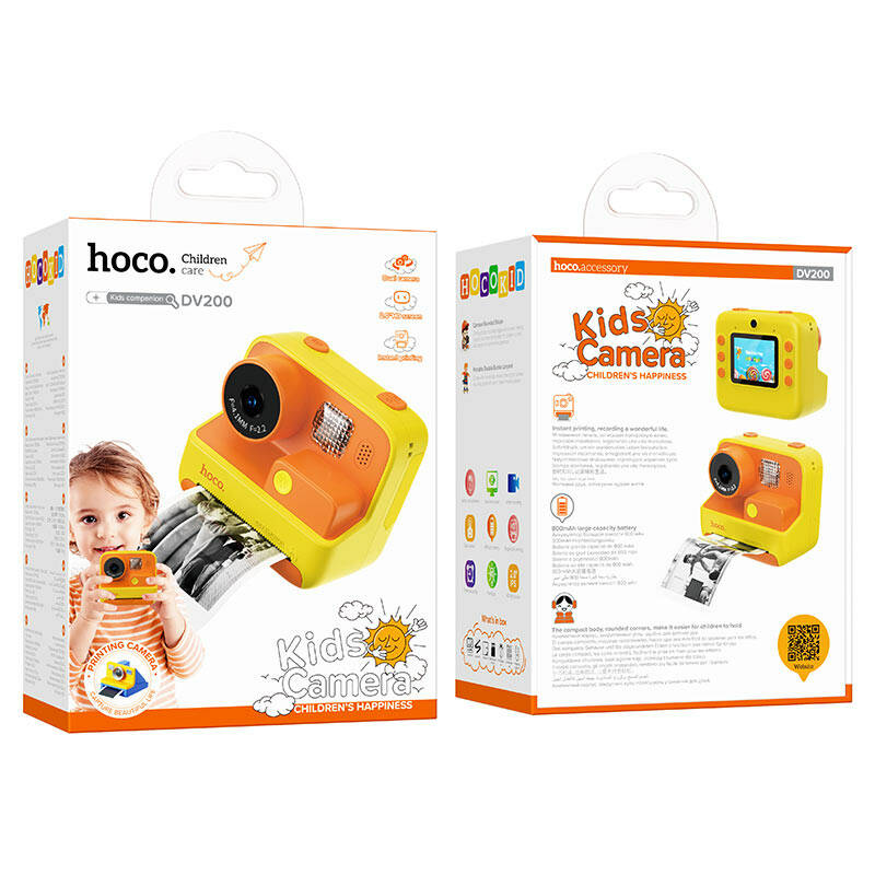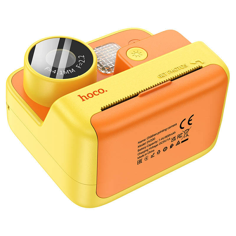 Дитячий фотоапарат HOCO DV200 з двома камерами та функцією миттєвого друку, підтримка microSD card, Orange/Yellow, Box