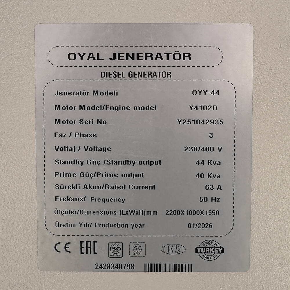Дизельний генератор OYAL OYY-44 YANG DONG Y4102D 44KVA/35.2KW, Альтернатор OYL184J, витрата 75% навантаження - 6,8 літрів/год, 230/400 В, 50 Гц (AVR+ATS) 2200*900*1350 мм, 890 кг, 125 л