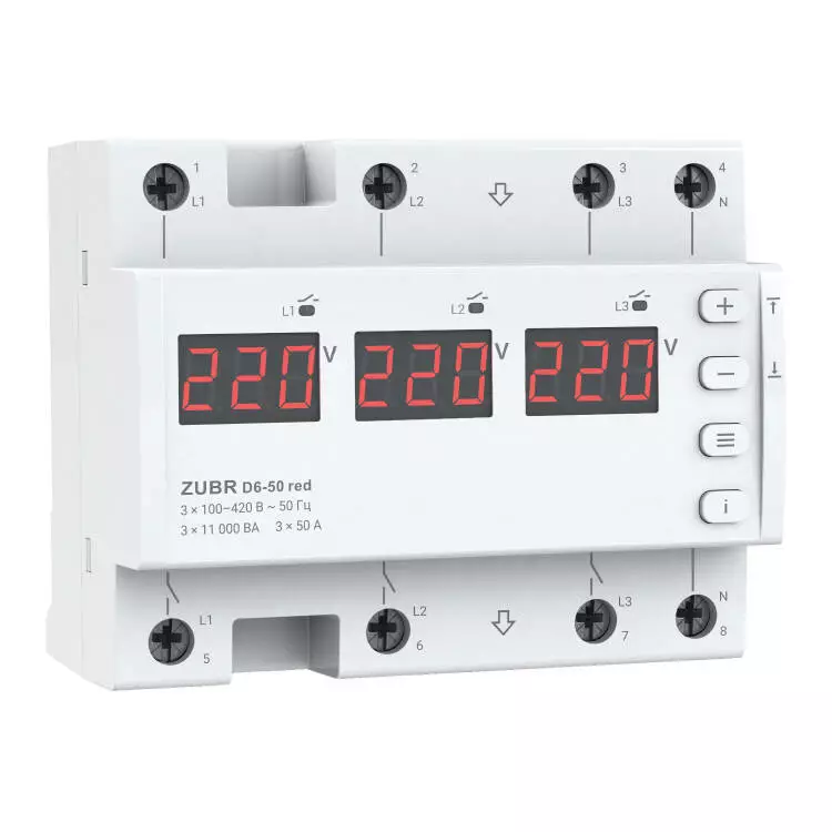 Двухрежимное реле напруги однофазное/трехфазное D6-50 на DIN-рейку, 3*50А, 3*11000ВА, 120-280В, шестимодульне з індикатором напруги (Червоний)