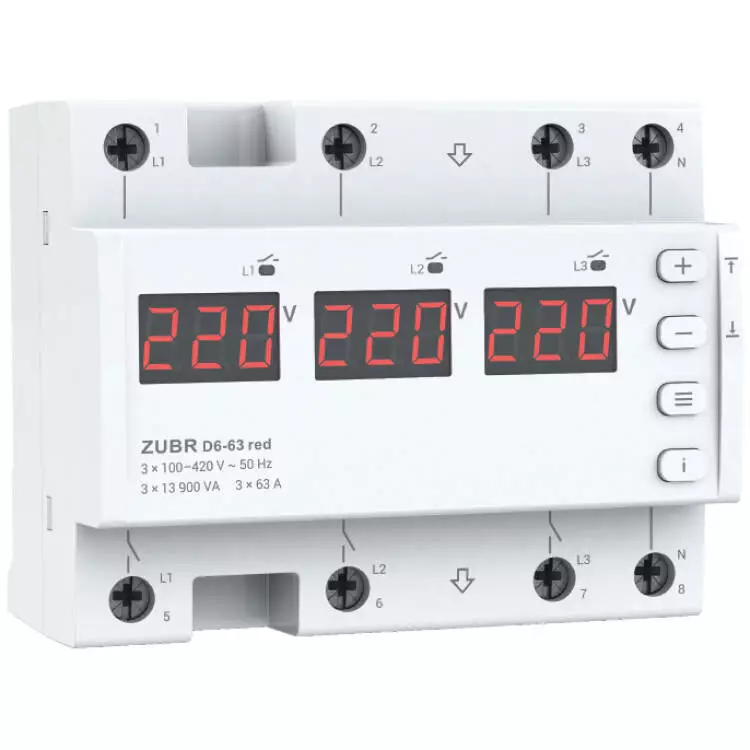 Двухрежимное реле напруги однофазное/трехфазное D6-63 на DIN-рейку, 3*63А, 3*13900ВА, 120-280В, шестимодульне з індикатором напруги (Червоний)