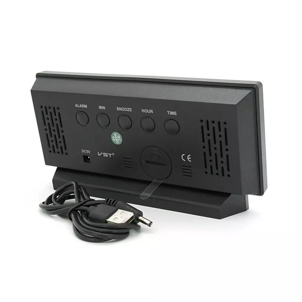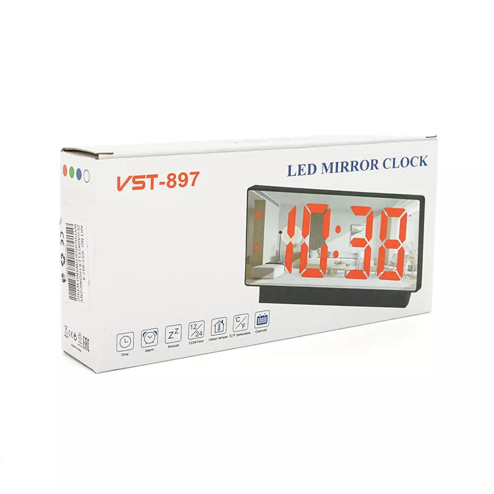 Електронний годинник VST-897 має дзеркальний дисплей, з датчиком температури та вологості, функцією будильника, живлення від кабелю USB та зеленого кольору.