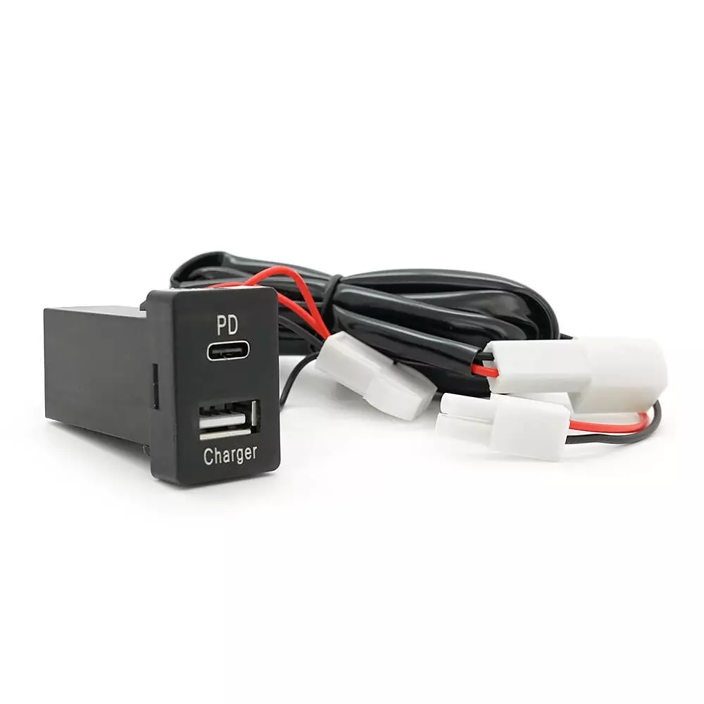 Flush-mounted car charger 38W-L01T03-Fuse, PD+QC, Type-C: 20W, USB: 18W, soldering wire kit with fuse, 33x22x58mm, Black