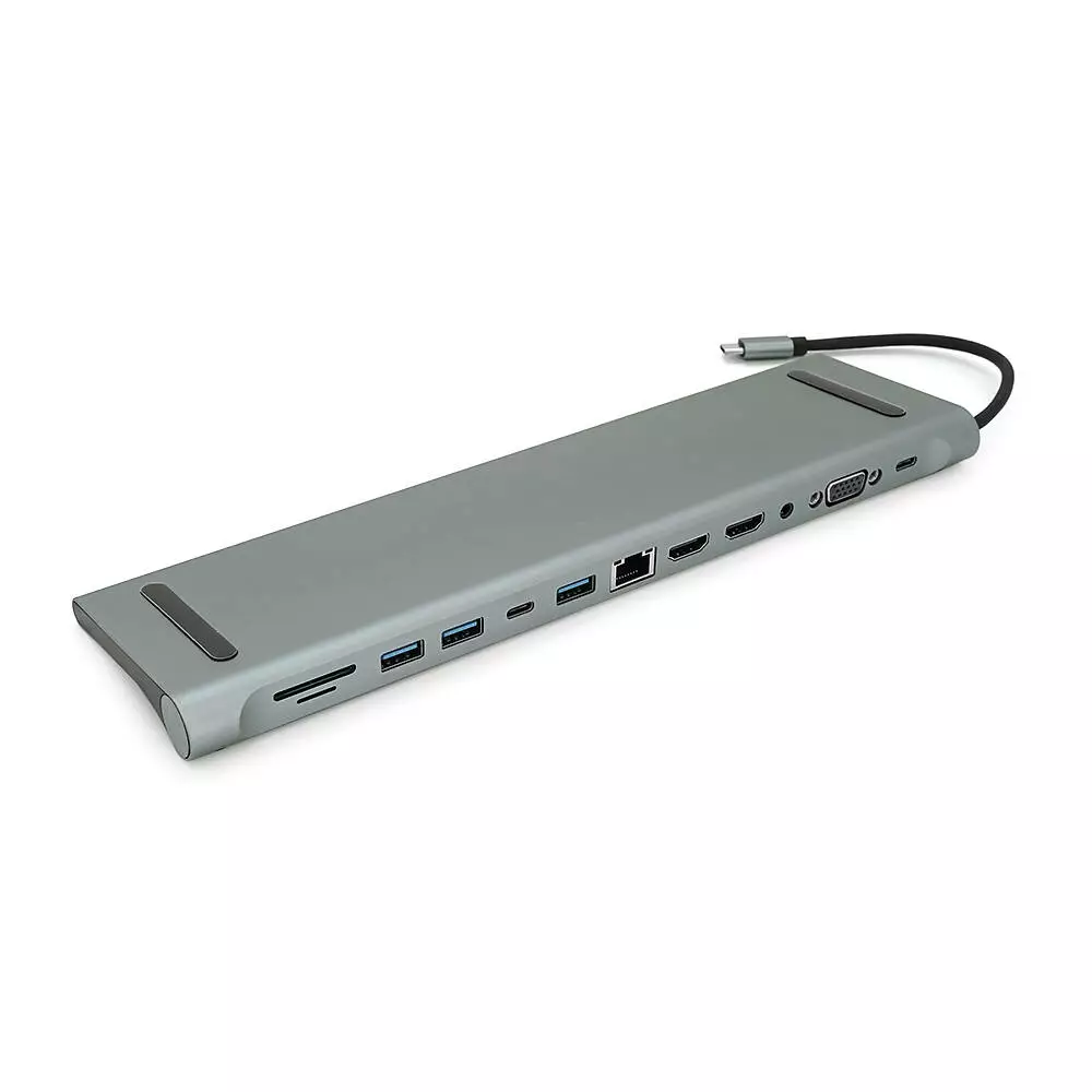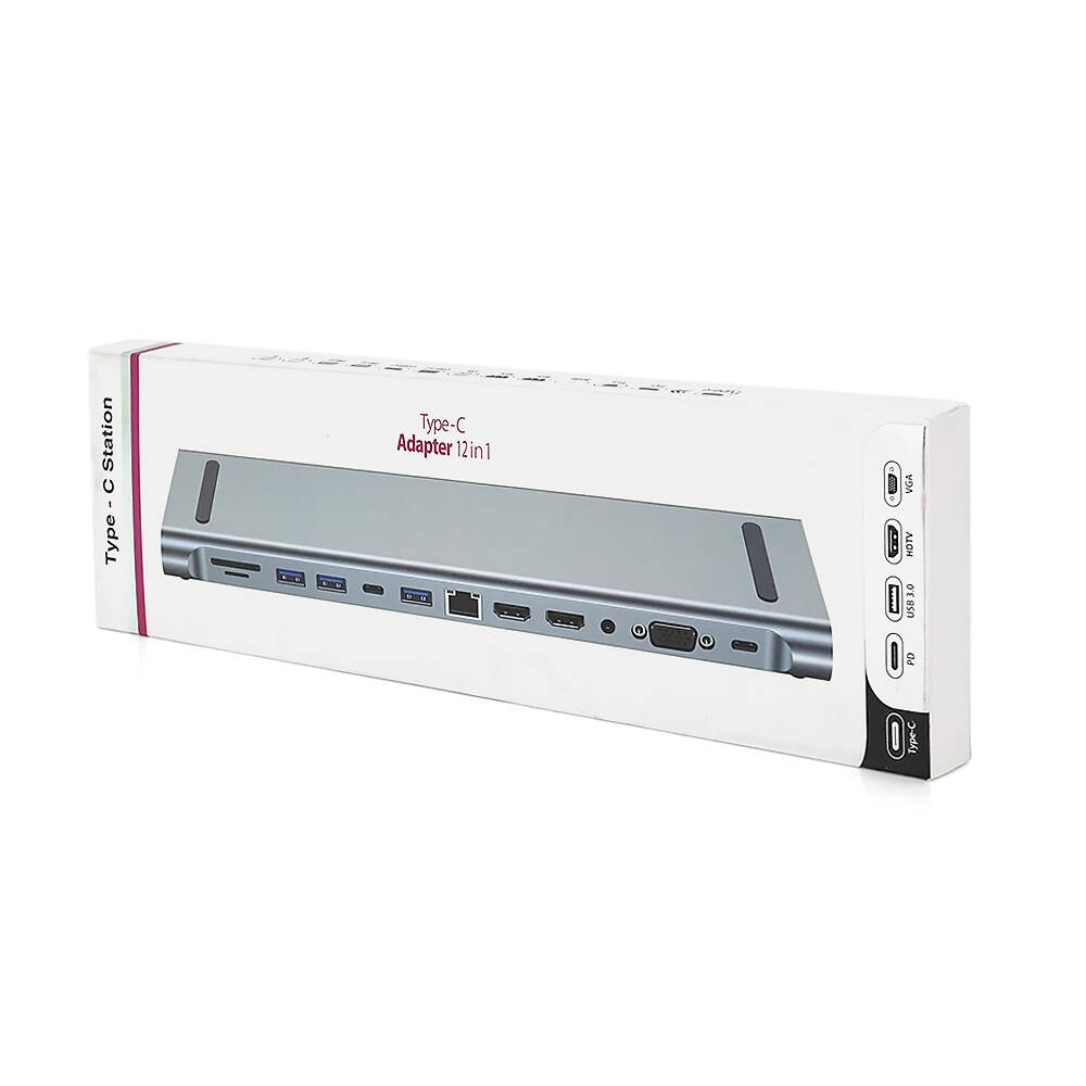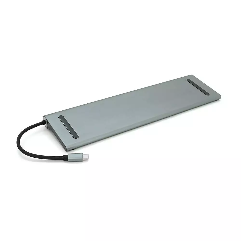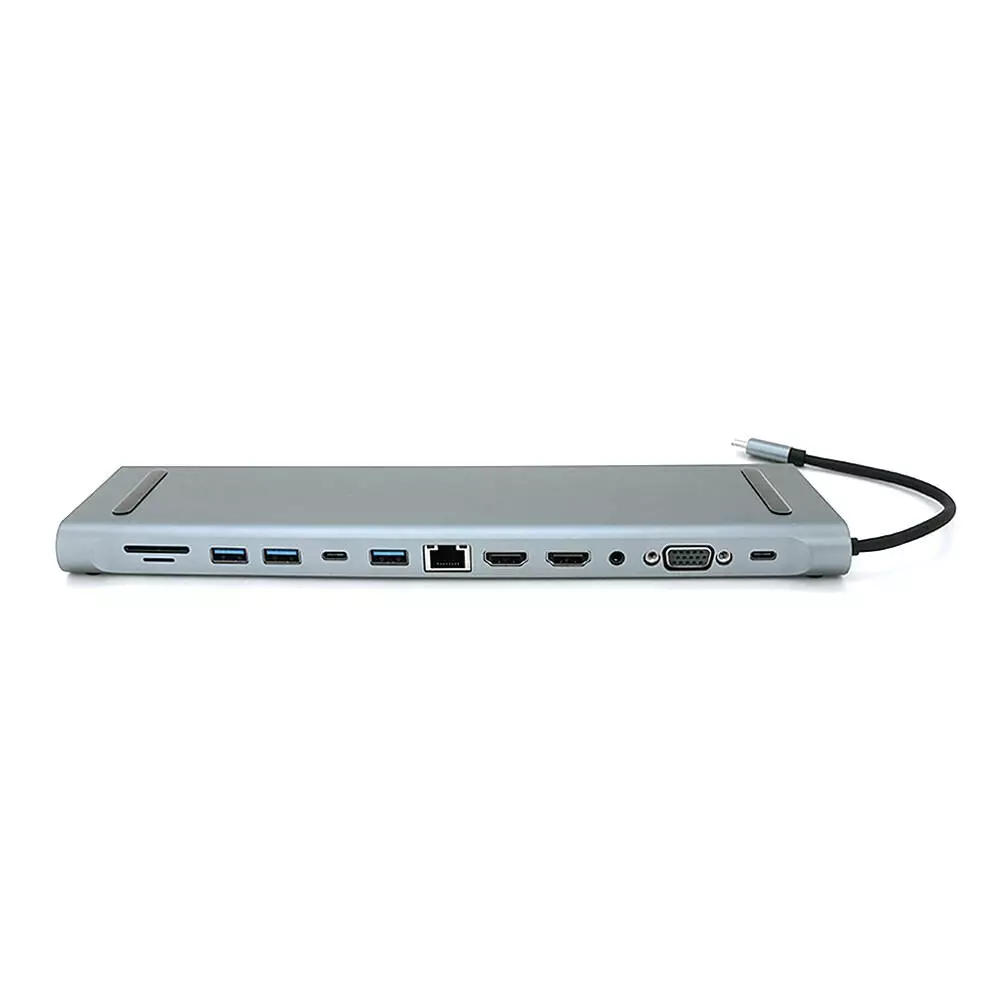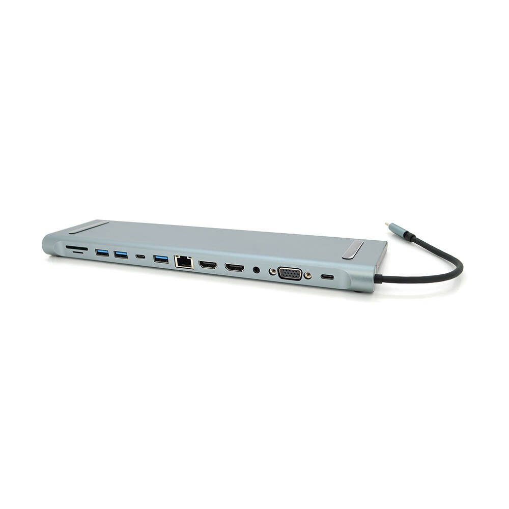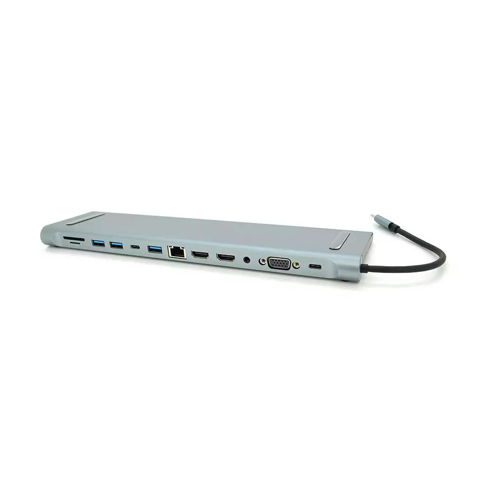 Хаб-конвертор 12 в 1 Type-C (тато) на Type-C(мама)+2*USB2.0(мама)+USB3.0(мама)+2*HDMI(мама)+VGA(мама)+SD/TF+RJ45+ jack3.5 (мама)+PD, 10cm, Silver, Box