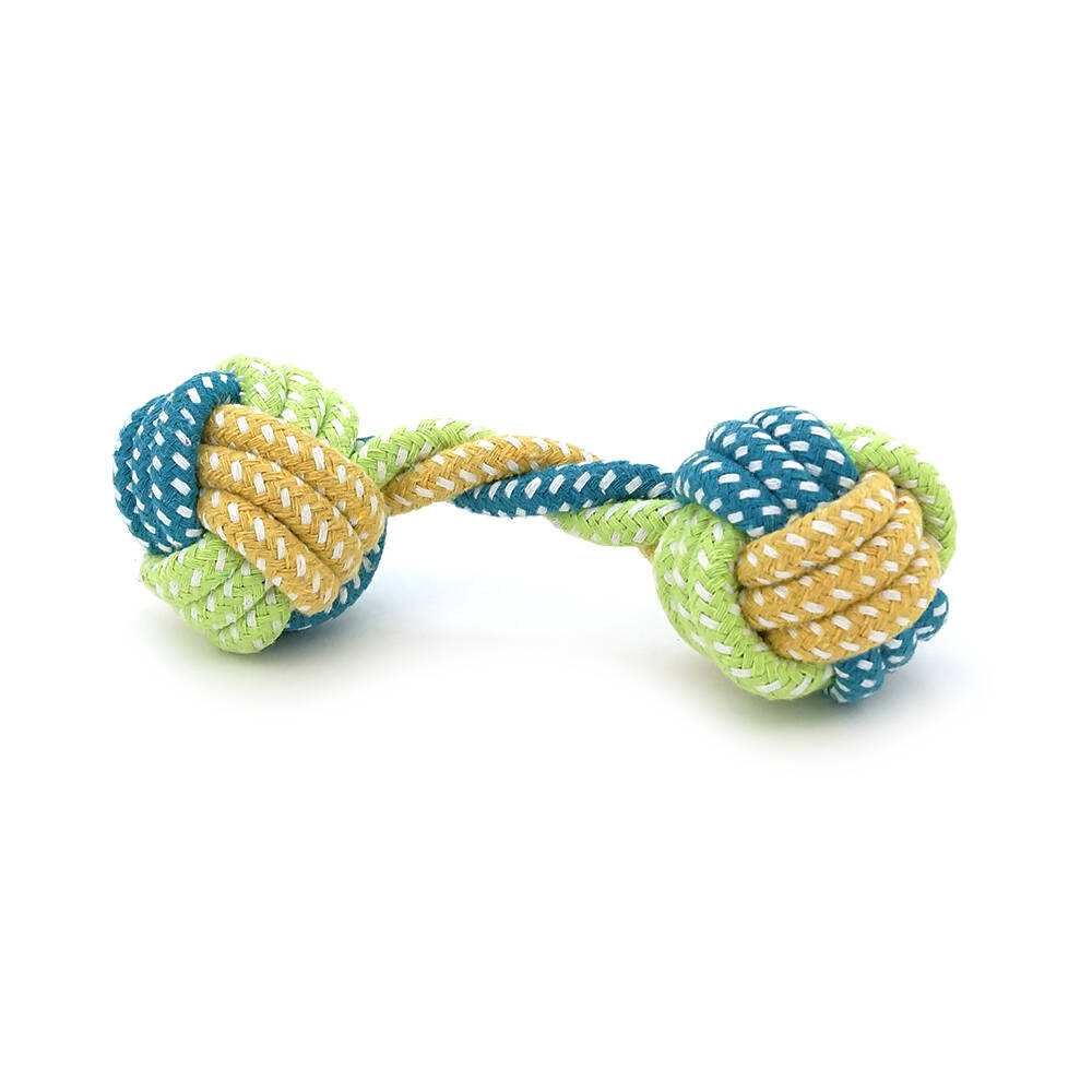 Іграшка для собак мотузка-апорт із вузлами. Форма гантелі. Розмір 6х18 см. Колір зелено-синій.