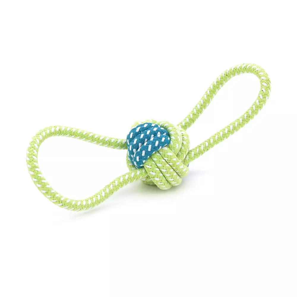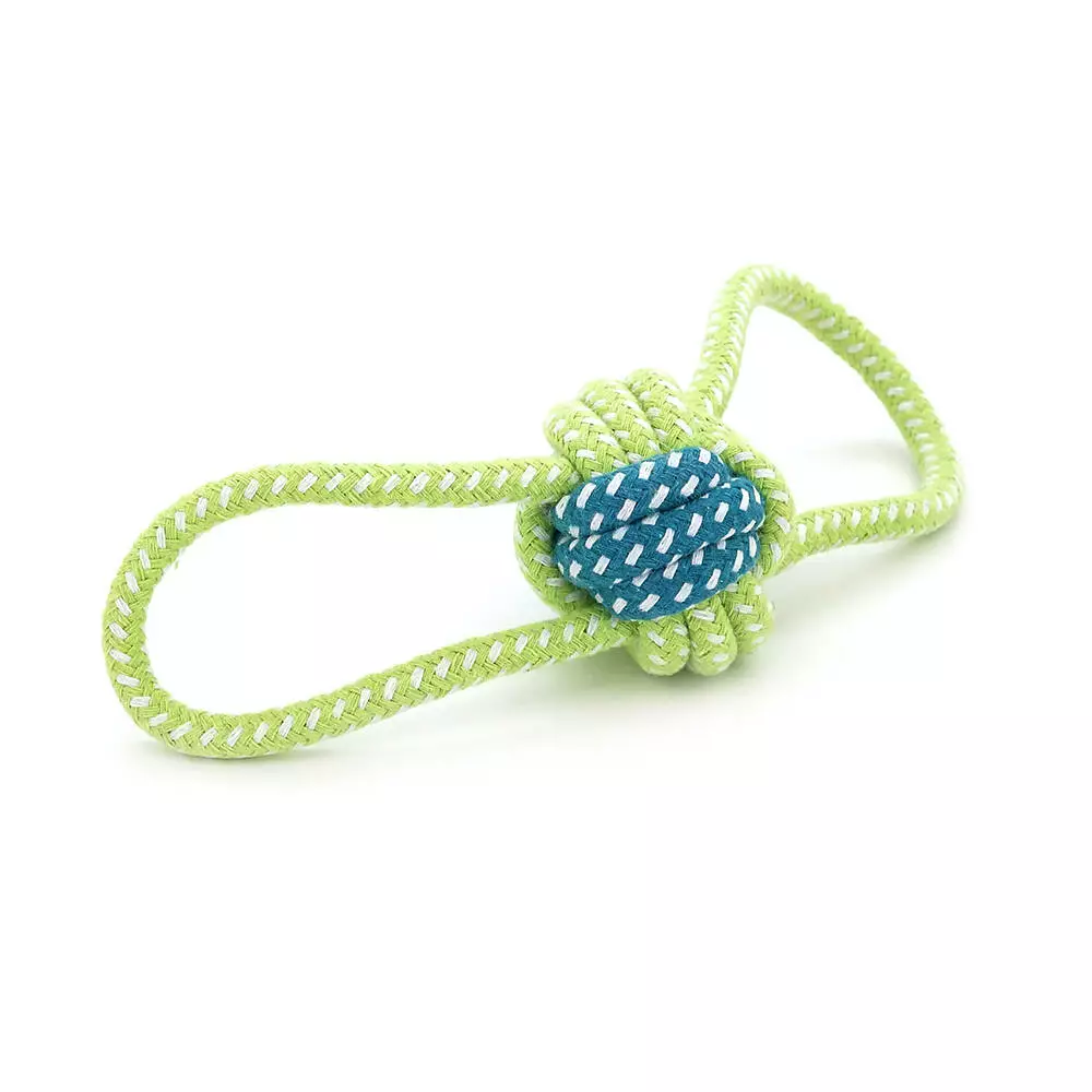 Іграшка для собак мотузка-апорт із вузлами. Форма кулі із двома петлями. Розмір 6х16 см. Колір зелено-синій.