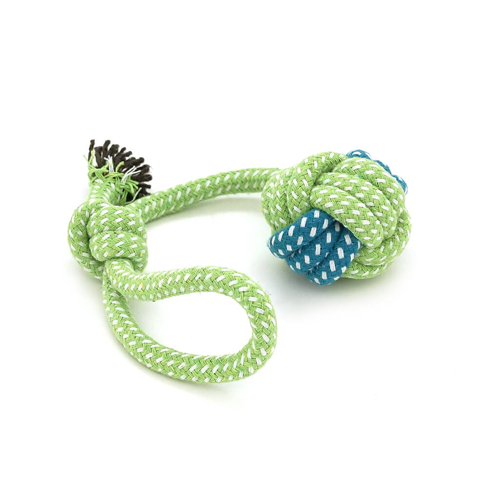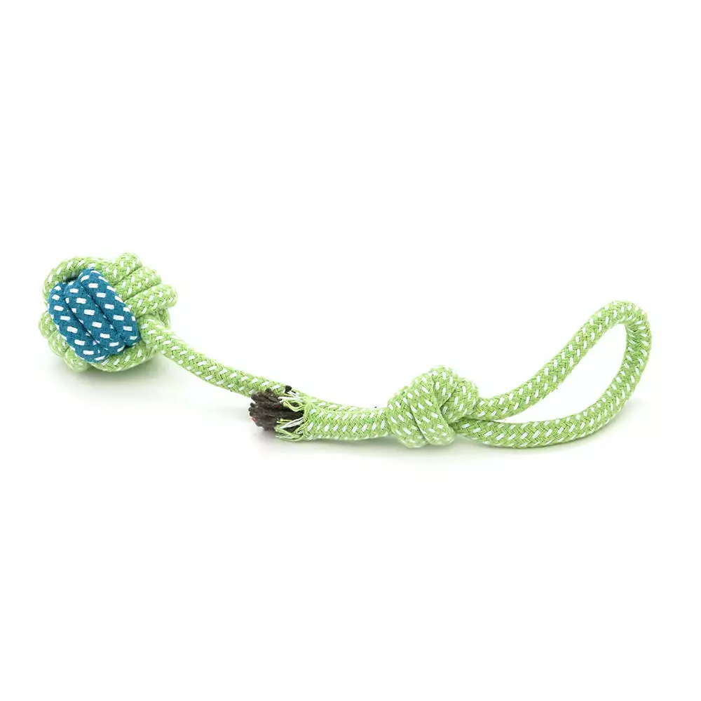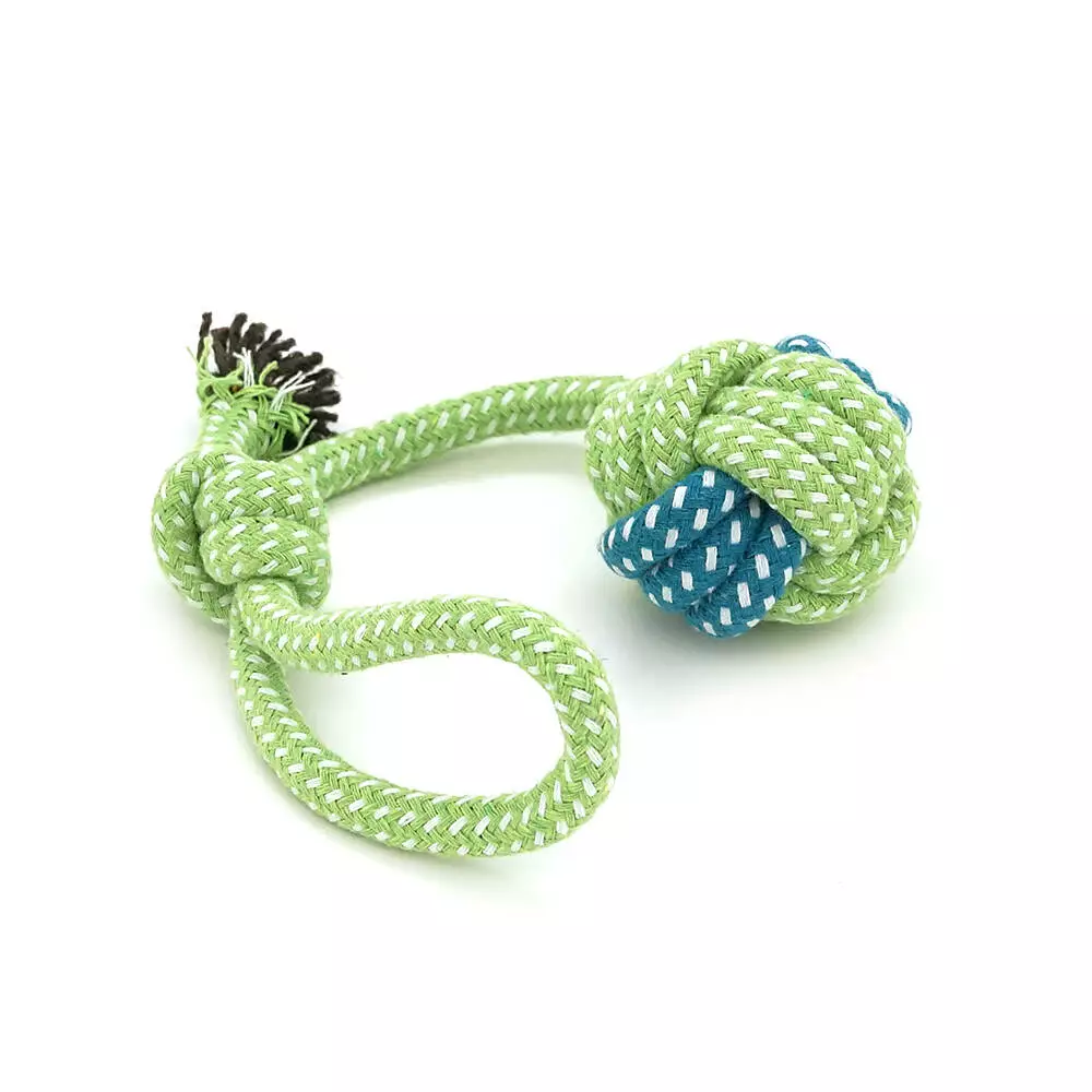 Іграшка для собак мотузка-апорт із вузлами. Форма кулі з петлею-вузлом. Розмір 6х14 см. Колір зелено-синій.