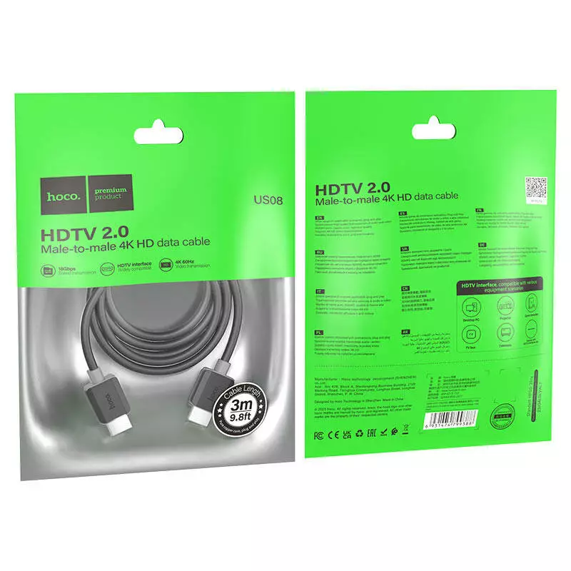 Кабель HOCO HDMI-HDMI 4Kx2K Ultra HD, 3m, v2,0, круглий Black, конектор Black, Blister