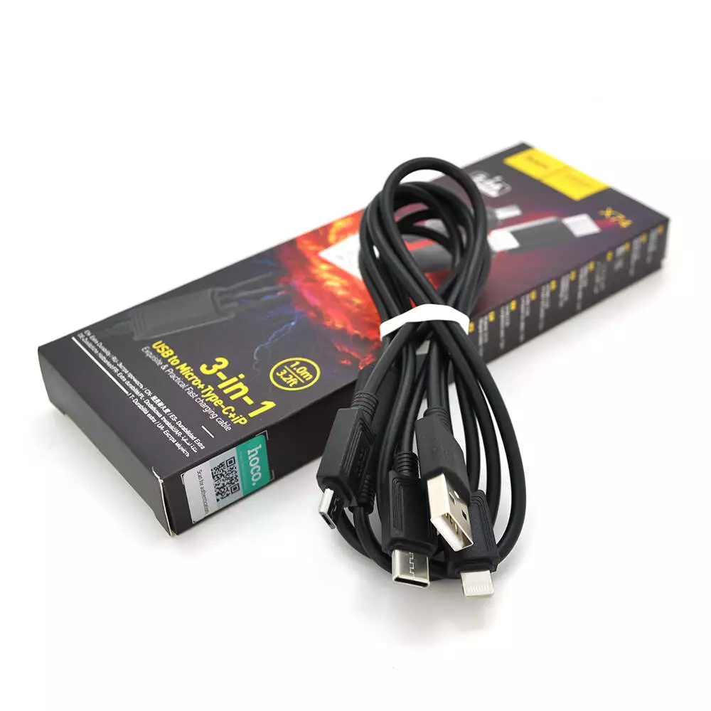 Кабель HOCO X74 USB-1 3 в 1 Micro/iPhone/Type-C є зручним та універсальним рішенням для зарядки та синхронізації пристроїв з різними типами роз'ємів. Він має довжину 1 метр і виконаний у чорному кольорі, що поставляється у зручній коробці.
