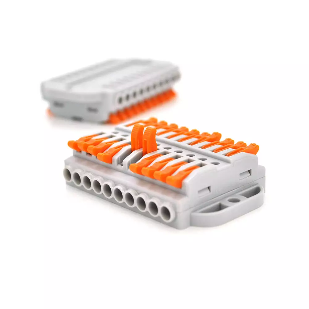 Клемна колодка з натискними затискачами 10-провідна WAGO K223-10P призначена для використання в розподільчих коробках. Вона має сірий колір та складається з 10 контактних пінів.