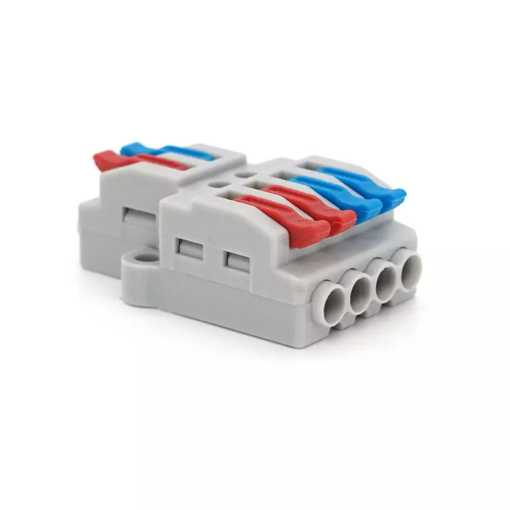 Паралельний розгалужувач-спліттер дротів SPL-42 є пристроєм з чотирма виходами, призначений для роботи з проводами діаметром від 0.08 до 4мм2. Він забезпечує високу якість розгалуження та спліттера проводів при напрузі до 400В та струму до 32А. Цей пристрій виконано у сірому кольорі.