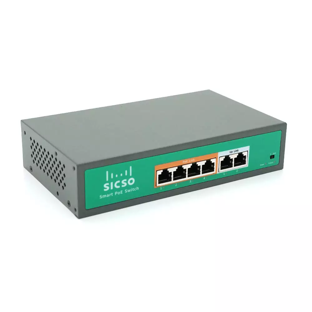 Комутатор POE SICSO 48V з 4 портами POE 100Мбіт + 2порт Ethernet (UP-Link) 100Мбіт, з посил. сигн. до 250м, корпус-метал, Silver, БП вбудований, Q30