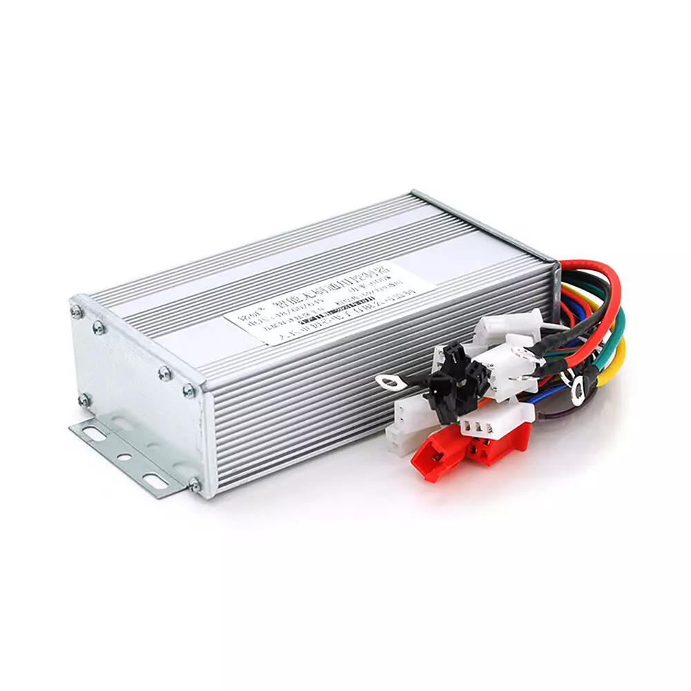 Контролер для електричного велосипеда або скутера має алюмінієвий корпус, з якого виходять різнокольорові дроти з роз'ємами.