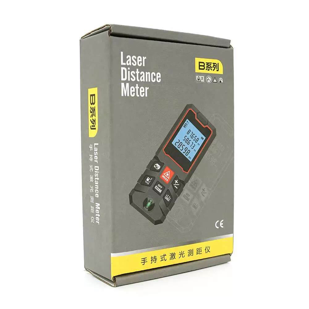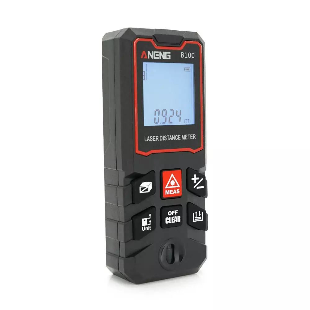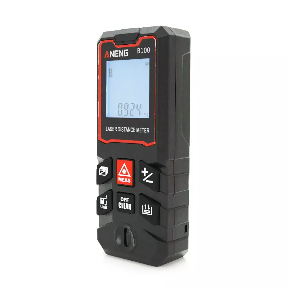 Лазерний далекомір ANENG AN-B100 оснащений цифровим РК-дисплеєм з підсвічуванням для зручності читання даних за будь-яких умов освітлення. Він підтримує функції швидкого вимірювання відстані, площі, об'єму та обчислення за теоремою Піфагора. Пристрій також дозволяє зберігати до 30 наборів даних.