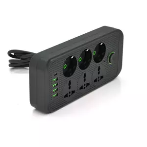 Мережевий фільтр F07U, 6 розеток (3 EU+3 Universal) + 4 USB + 1PD, кнопка включення з індикатором, 2 м, 3х0,75 мм, 2500W, Black, Box