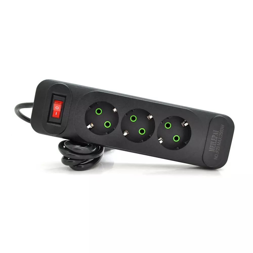 Мережевий фільтр F23, 3 розетки EU, кнопка включення з індикатором, 2 м, 3х0,75мм, 2500W, Black, Box