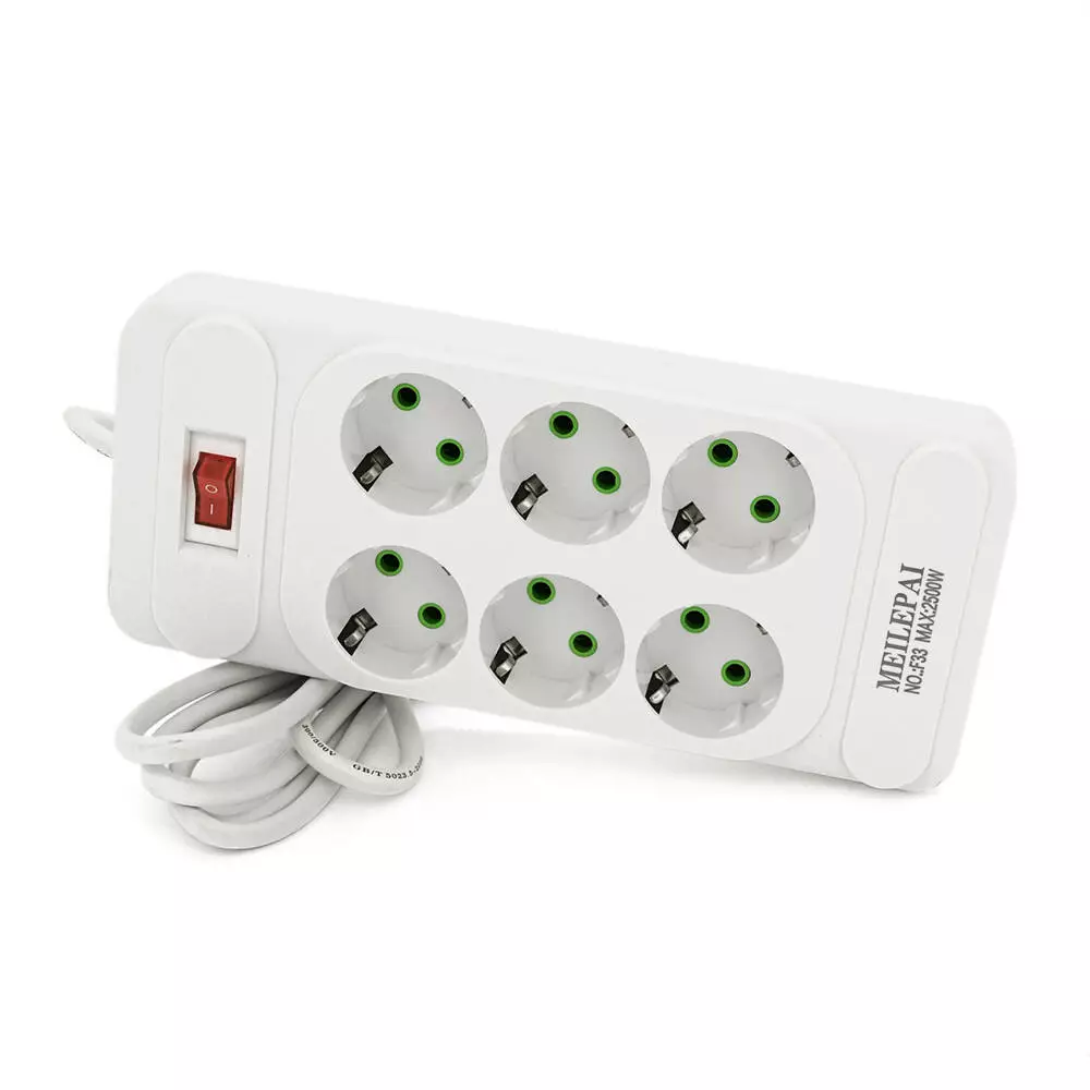 Мережевий фільтр F33, 6 розеток EU, кнопка включення з індикатором, 2 м, 3х0,75 мм, 2500W, White, Box
