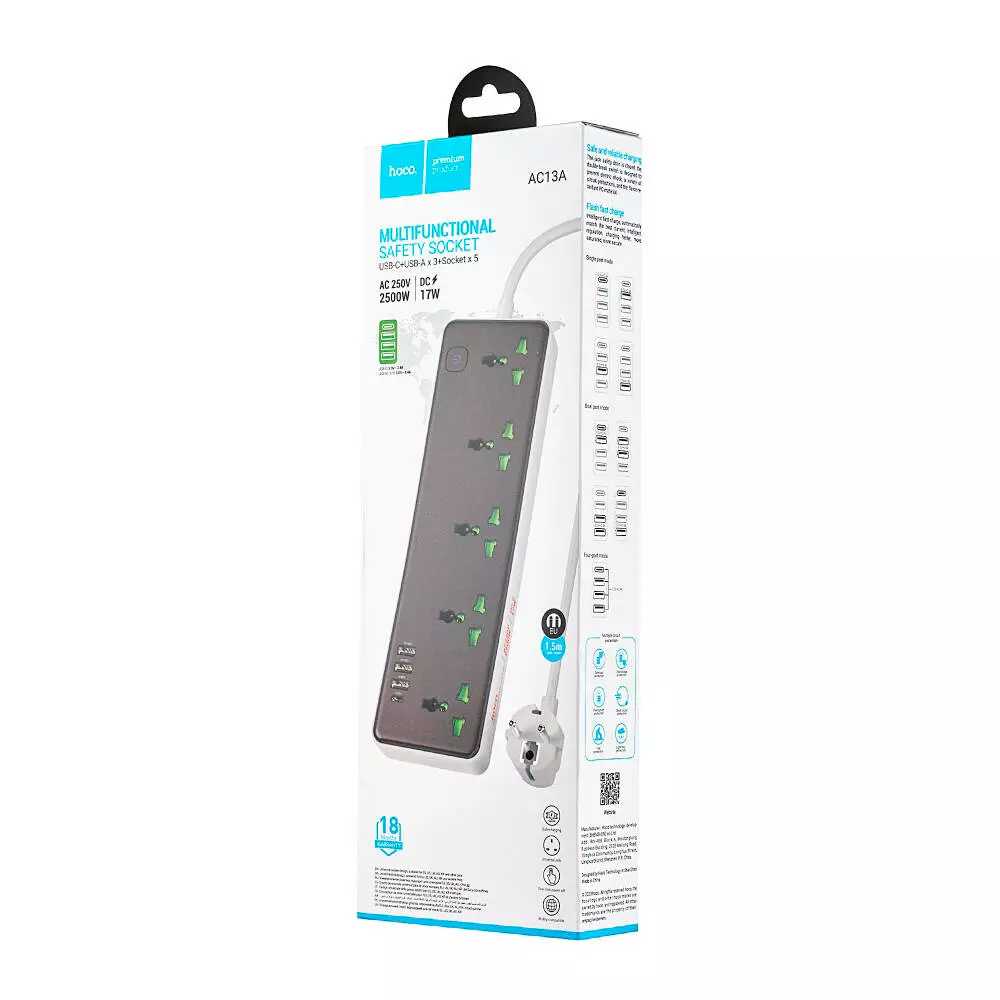 Мережевий фільтр HOCO AC13A на 5 розеток + 3 USB + USB-C, 17W, кабель 1,5 м, 220В, Black, Box