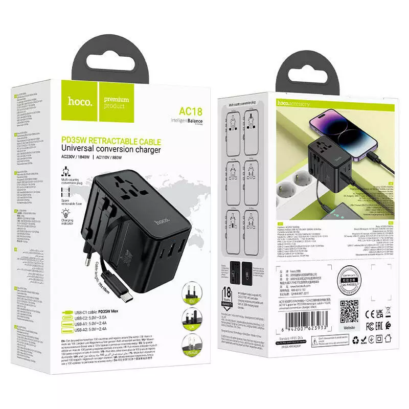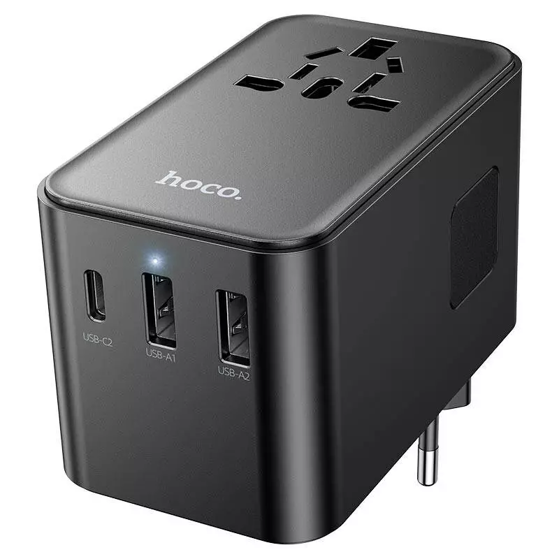 Мережевий фільтр HOCO AC18A на 1 розетку + 2 USB + USB-C, 35W, кабель 1,5 м, 220В, Black, Box