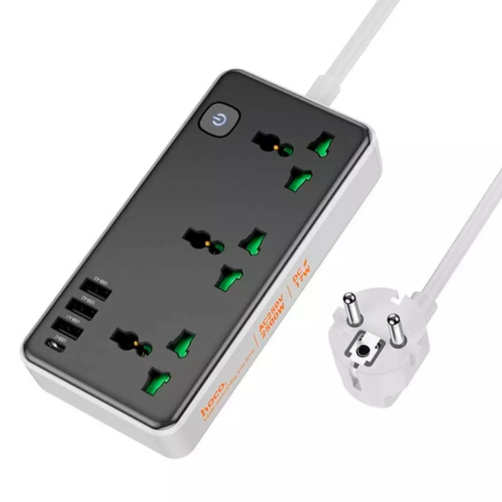 Мережевий фільтр HOCO AC7A на 3 розетки + 3 USB+USB-C, 17W, 220В, кабель 1,5м, Black/White, Box