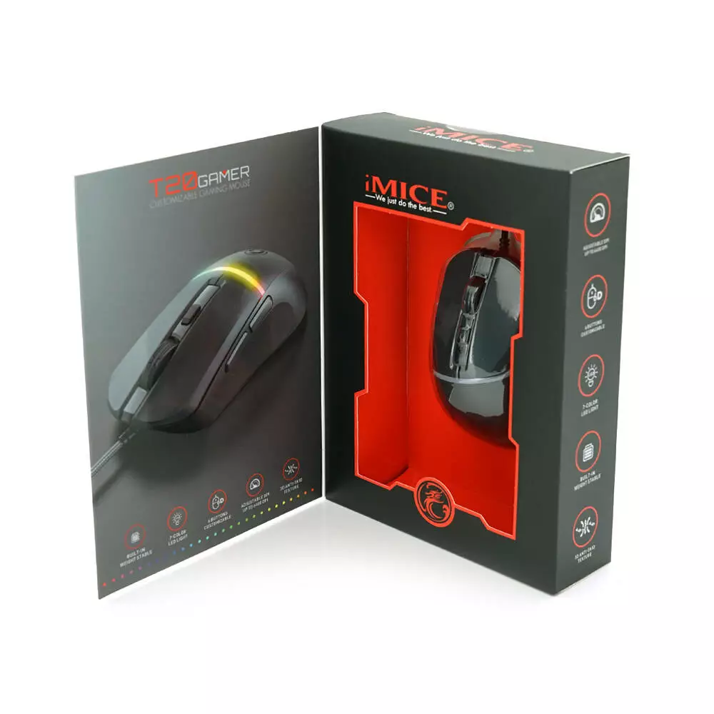 Дротова миша iMICE T20 з 6 кнопками та підсвічуванням Led Lighting, з роздільною здатністю 1000/1600/3200/6400 DPI. Сумісна з операційними системами Windows XP/Vista/Win7/8/10 та Mac OS X. Колір чорний, поставляється в кольоровій коробці.