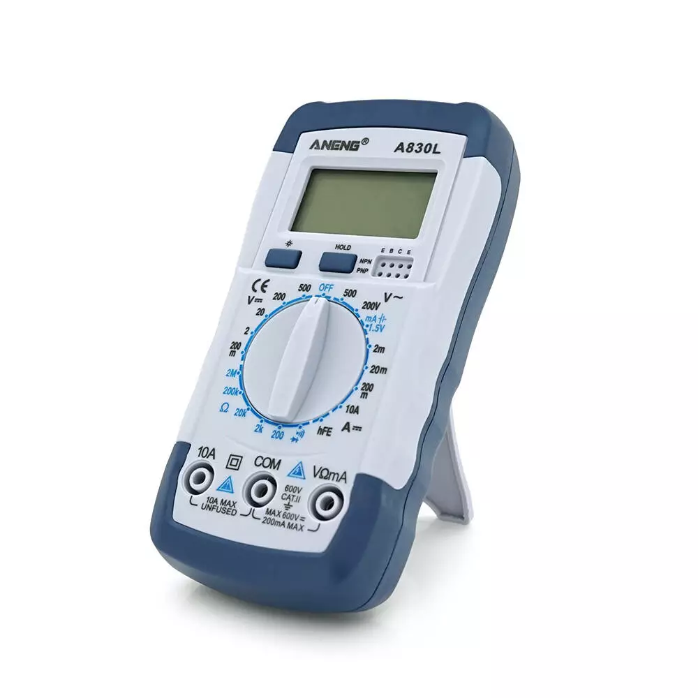 Мультиметр ANENG AN-A830L. Вимірювання: V DC, V AC, A DC, A AC, Ω, C, F, hFE, °C. Функції: продзвонювання, перевірка діодів, транзисторів.