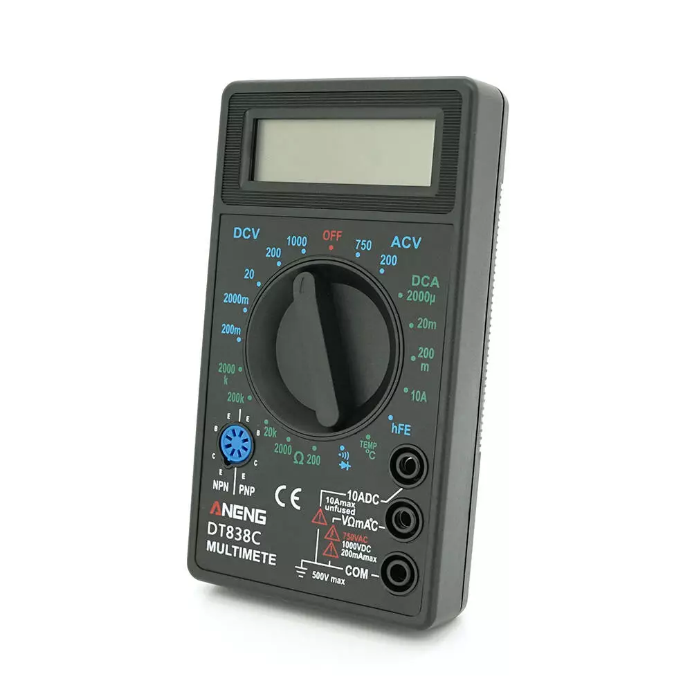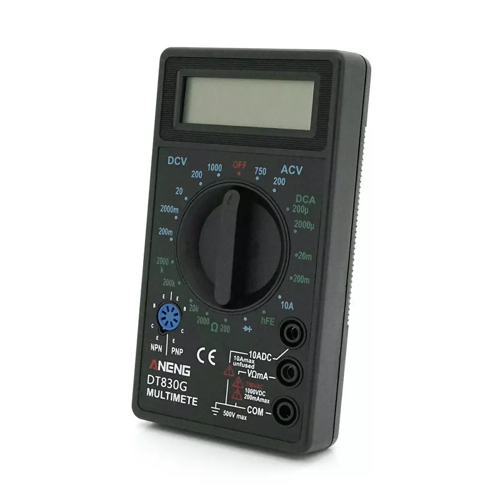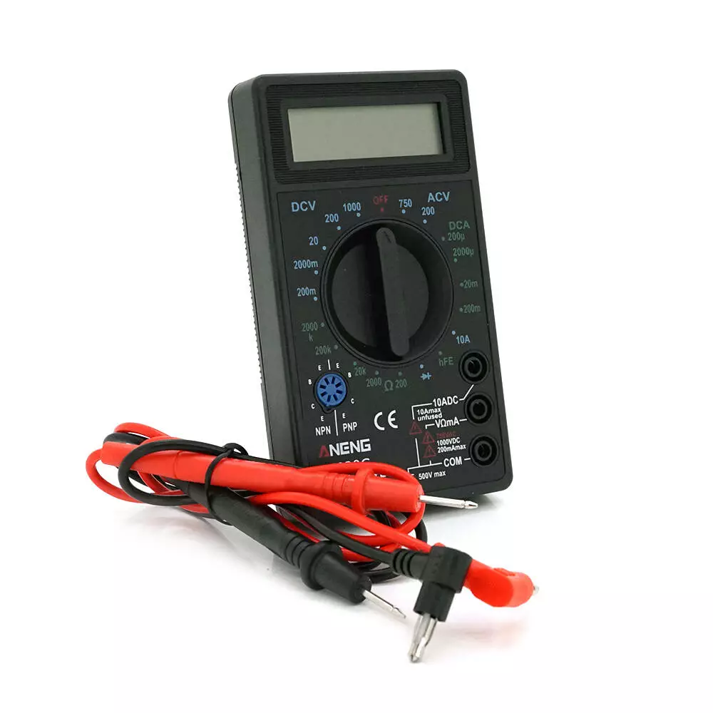 - Портативний цифровий мультиметр для вимірювання AC/DC напруги, DC струму, опору та тестування транзисторів та діодів.