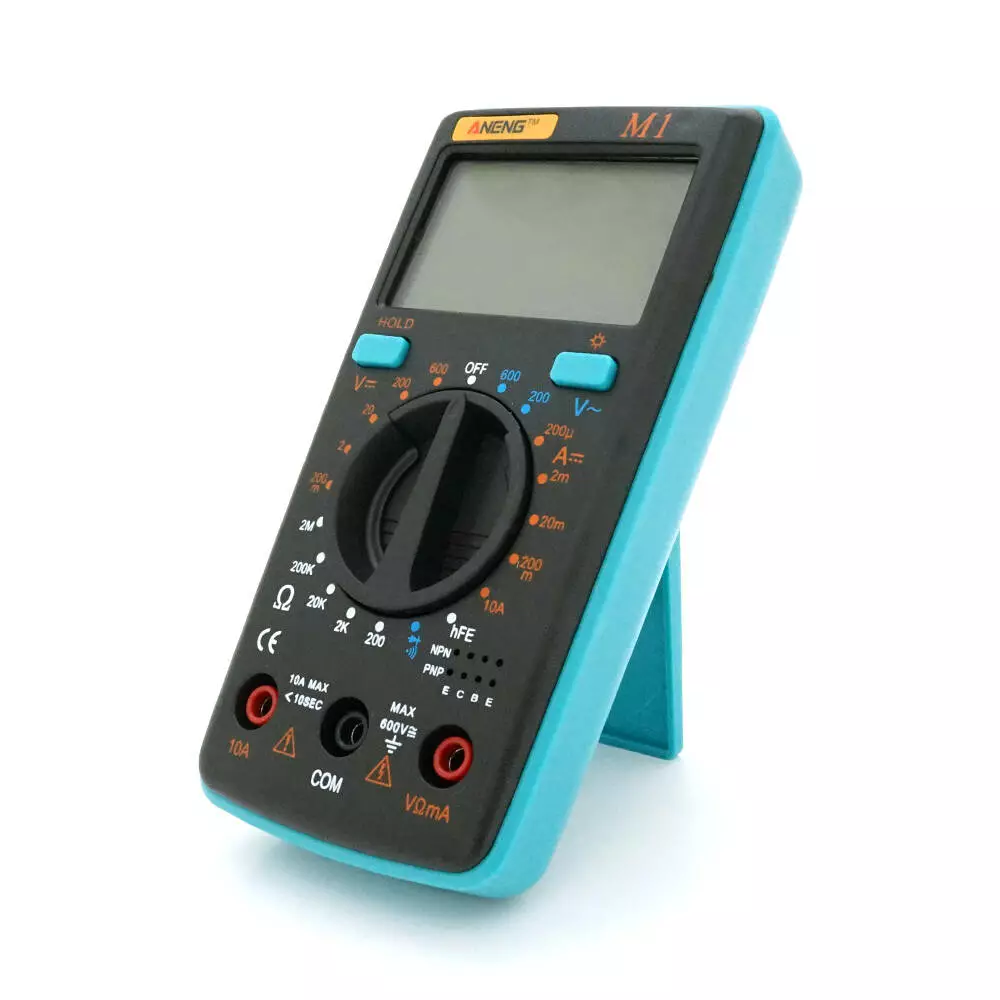 Мультиметр ANENG AN-M1. Вимірювання: VDC, VAC, ADC, Ω. Функції: продзвонювання, перевірка діодів, тест транзисторів, Hold, підсвічування.