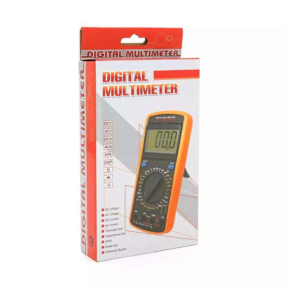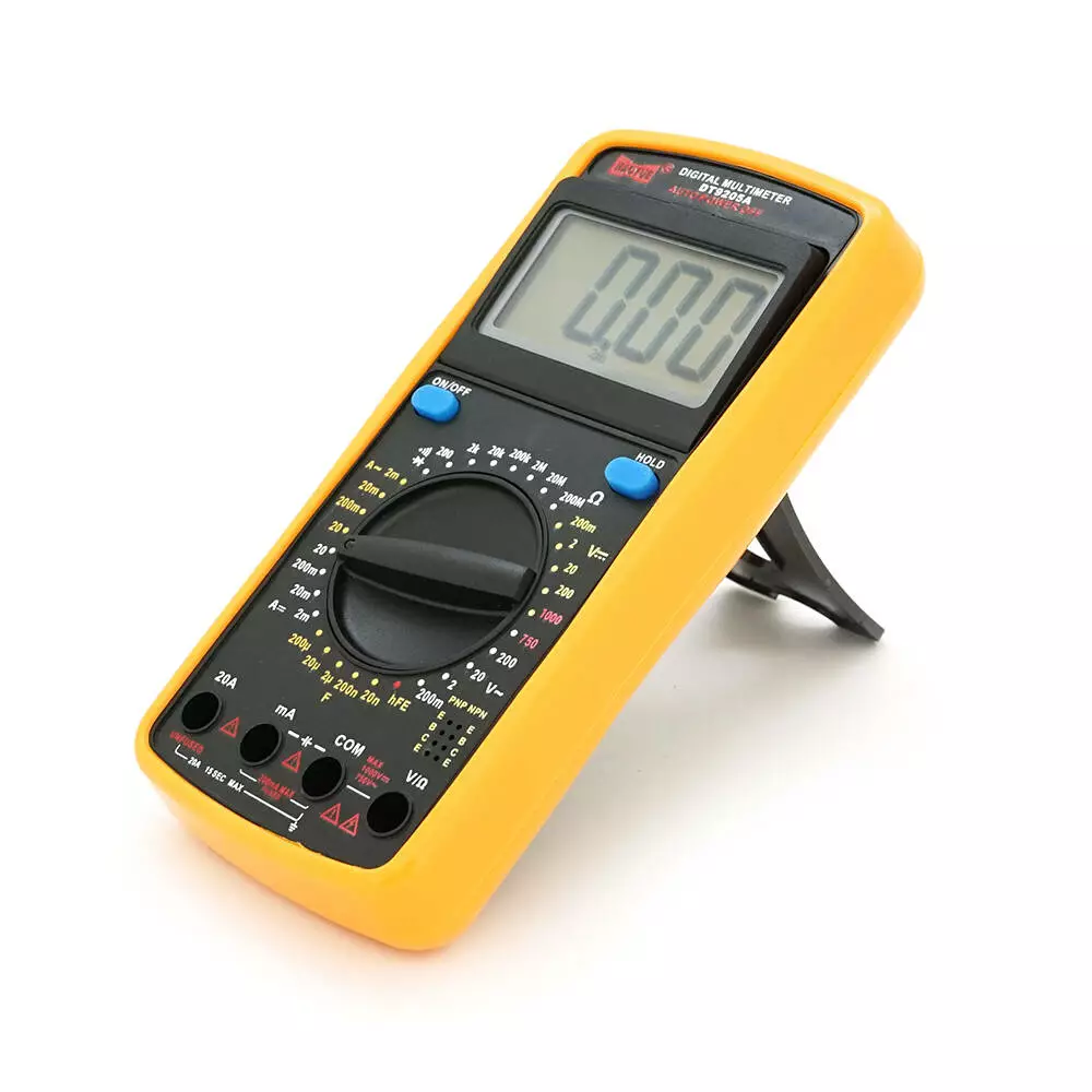 Мультиметр HAOYUE DT-9205A Вимірювання: V (AC/DC), A (AC/DC), Ω, hFE, тест діодів, продзвонювання. Функції: Data Hold, перевірка транзисторів.