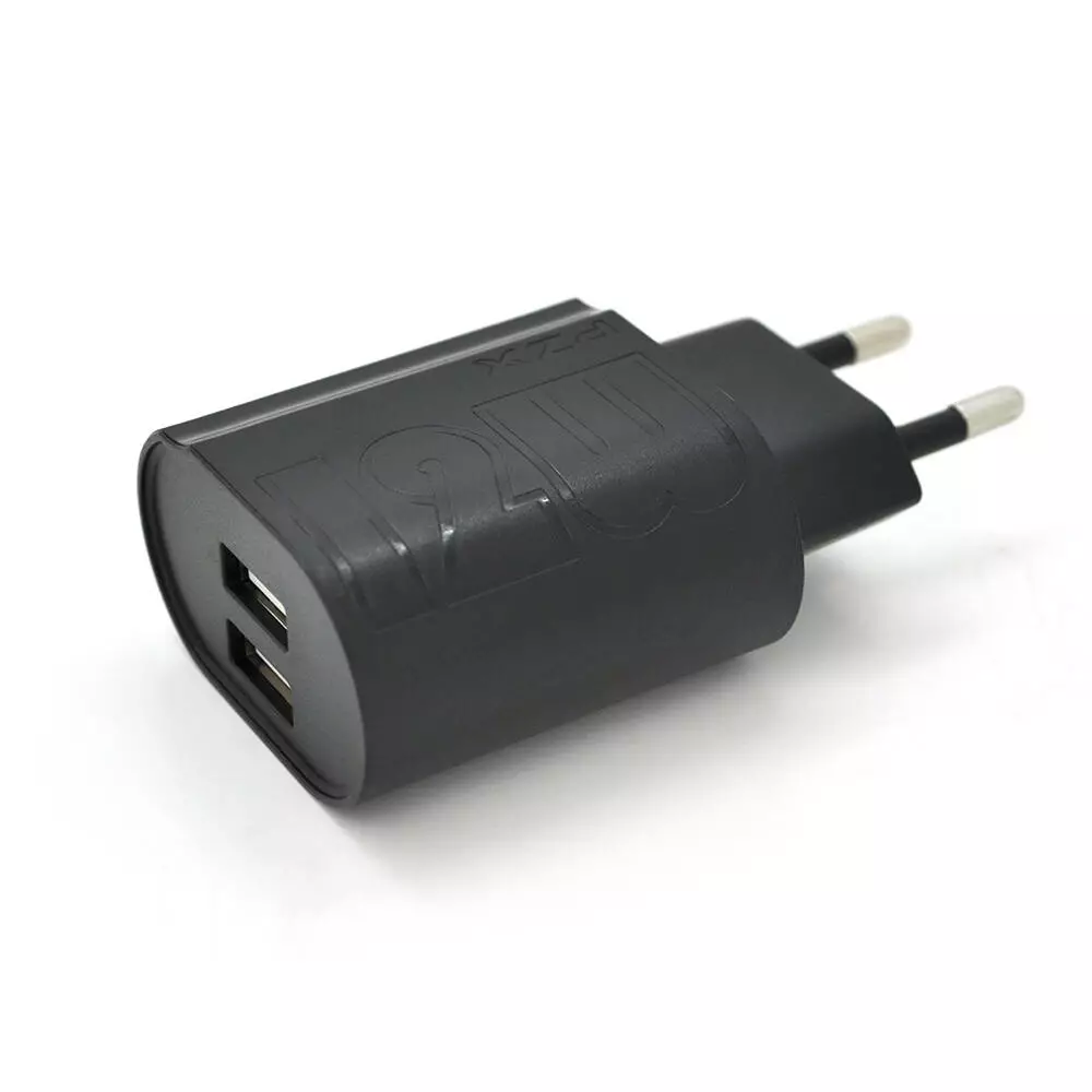компактний зарядний пристрій з двома USB-портами і кабель для