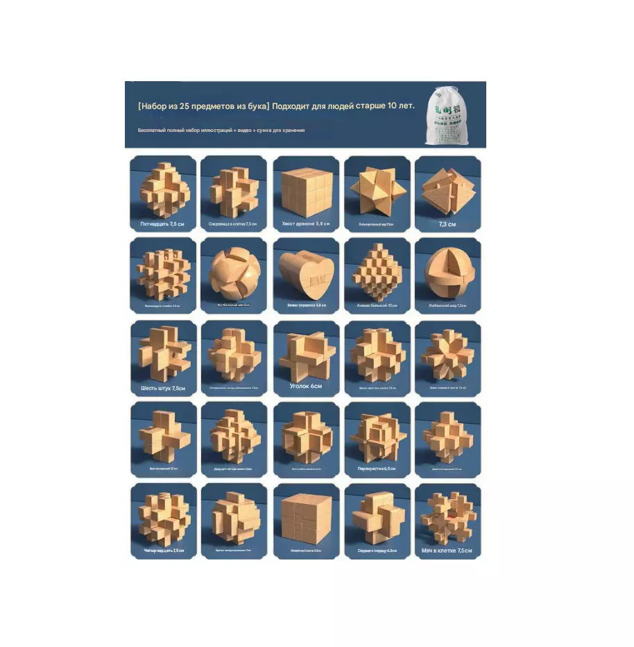 Набір 3D з 26-головоломки. Метріал: дерево. Розміри елементів 5,7-10 см. Сумка для зберігання. 290х200х210 мм. Вага: 2.125 кг.