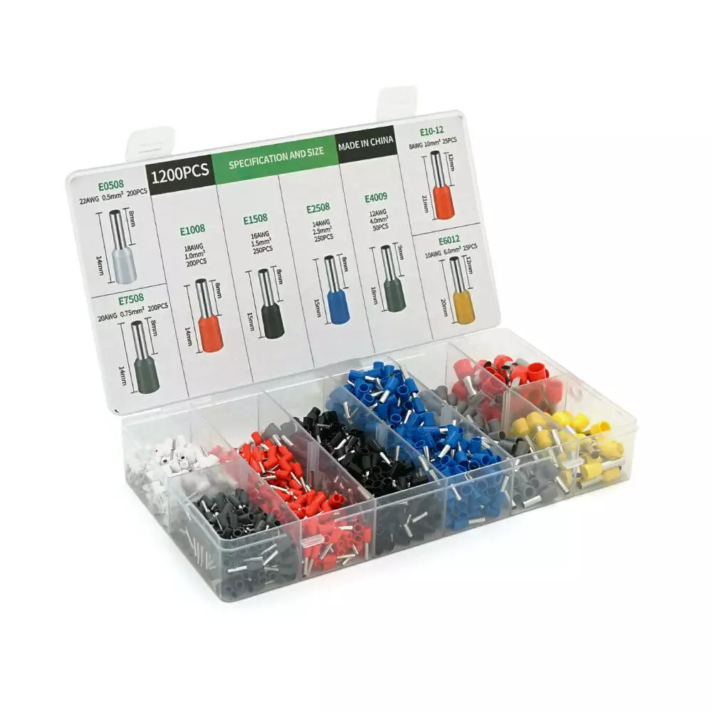 Набір клем/наконечників 1200шт(E0508w-200 E2508b-250,E1008r-200,E1508bl-250,E4009gr-50,E7508gr-200,E6012y-25. E1012r-25)у боксі
