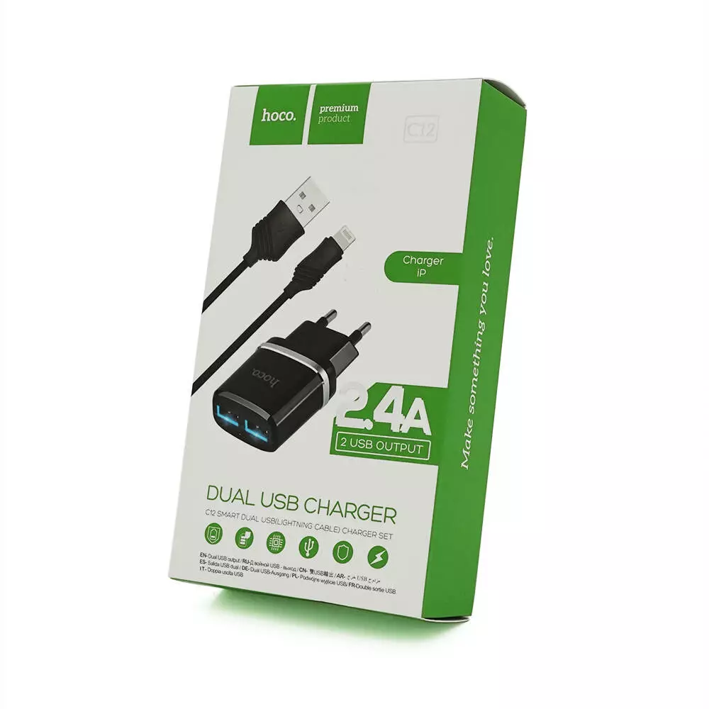 Набір СЗУ 110-240V HOCO C12 + кабель Lighting, 1xUSB, 2.4A, кабель 1м, Black, Blister