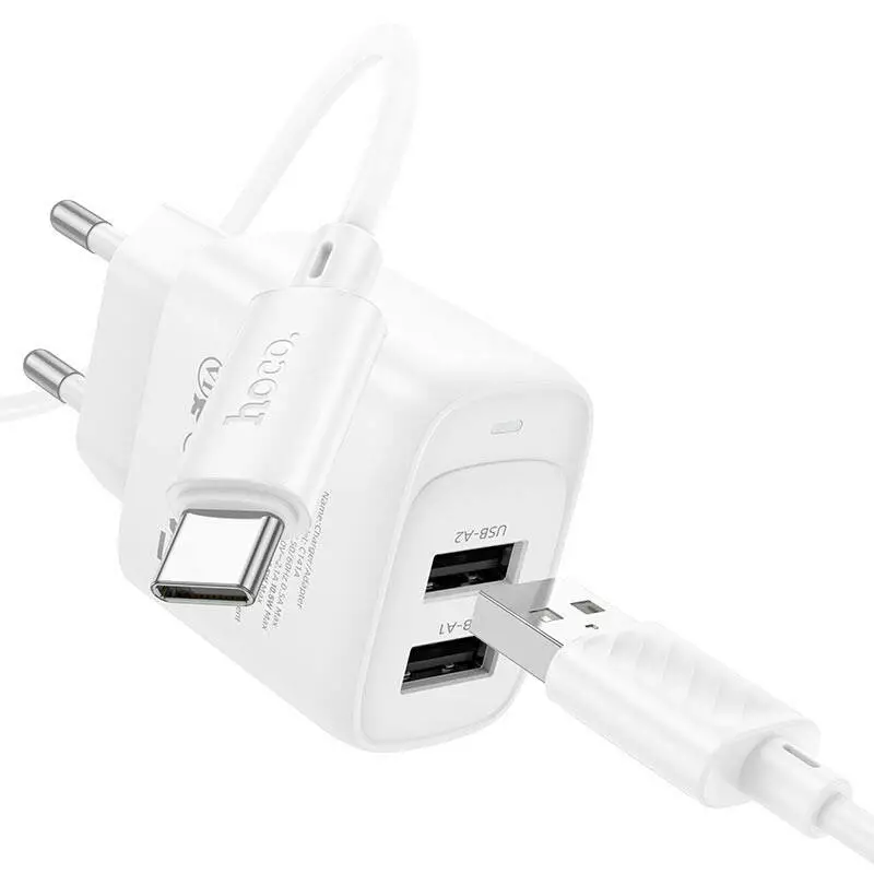 Набір СЗУ 110-240V HOCO C141A + кабель Type-C, 2xUSB, PD20W, 1м кабель, White, Box