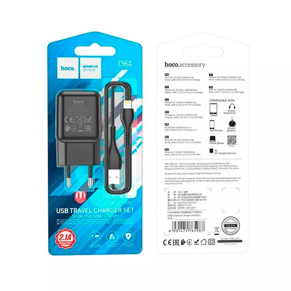 Набір СЗУ 110-240V HOCO C96A+ кабель Lighting, 1xUSB, 2.1A, кабель 1м, Black, Blister