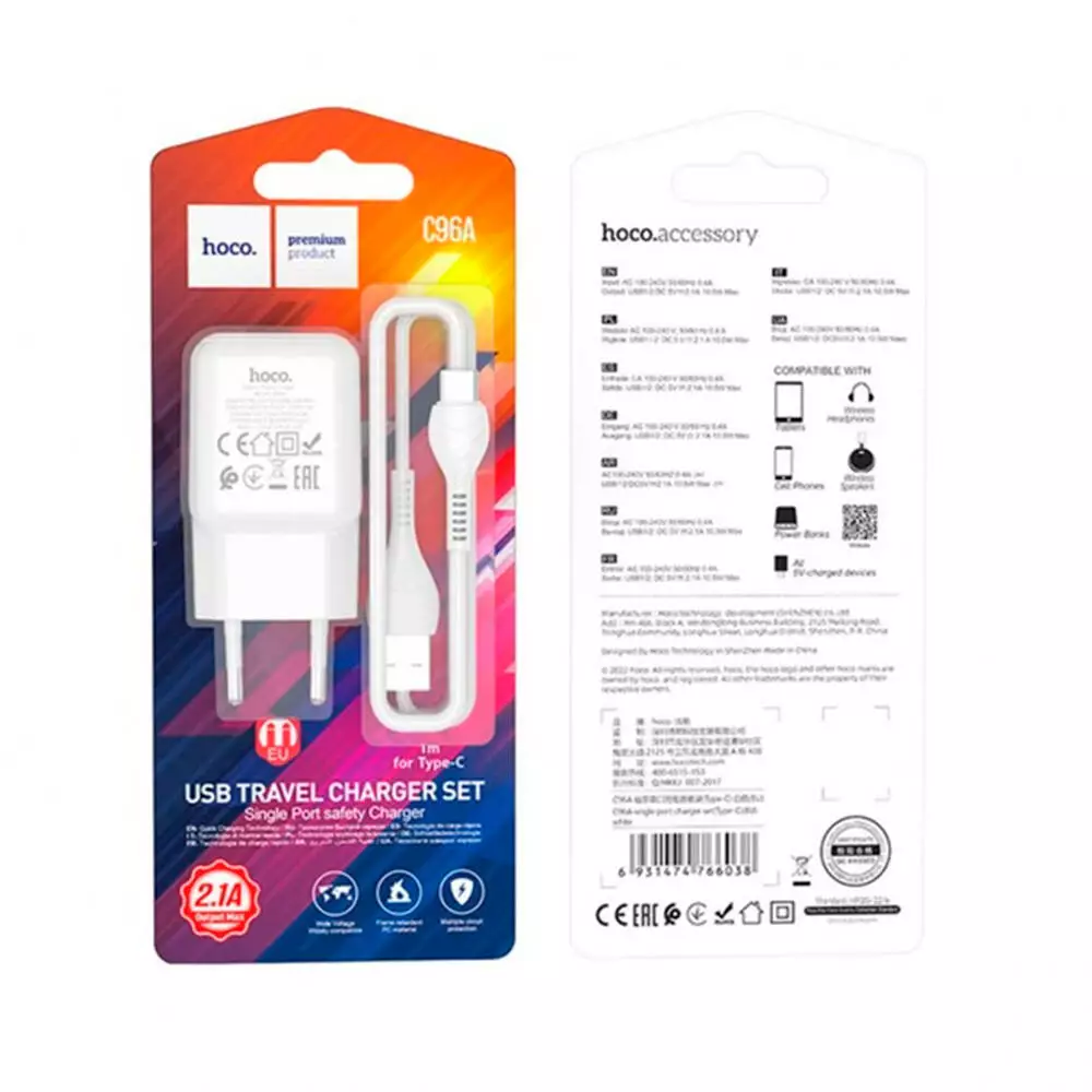 Набір СЗУ 110-240V HOCO C96A+ кабель Type-C, 1xUSB, 2.1A, кабель 1м, White, Blister