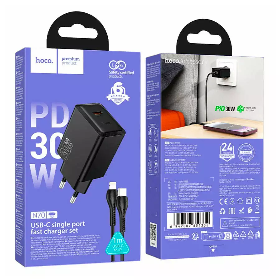 Набір СЗУ HOCO N70 + Type-C/Lighting кабель, 1xUSB+1xUSB-C, PD30W+QC3.0, кабель 1м, Black, Box